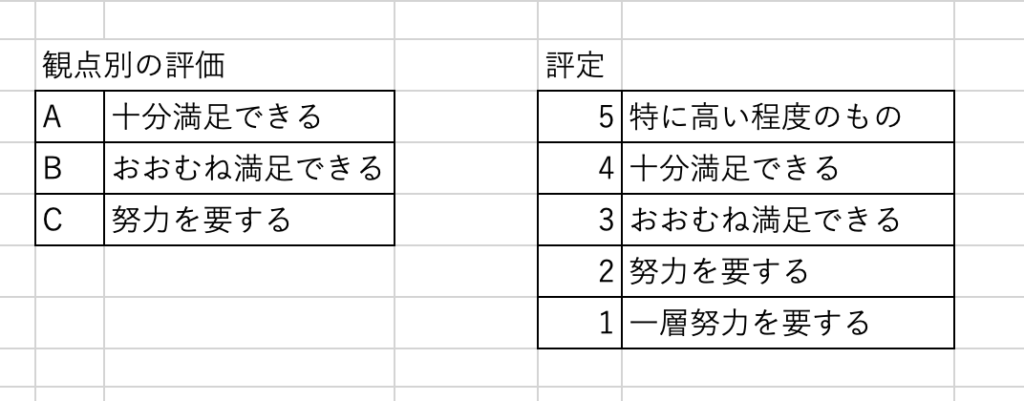 たとえば中学ではこんなふうに評価がつけられるはずです。