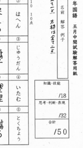 お母さま、お父さまは合計の得点に注目をされるでしょうが、実は、大切なのは「知識・技能」と「思考・判断・表現」のそれぞれの得点なのです。ある意味では合計点は評価には何の関係もなく、そういった意味で平均点も出しても意味のないものになっているのです。