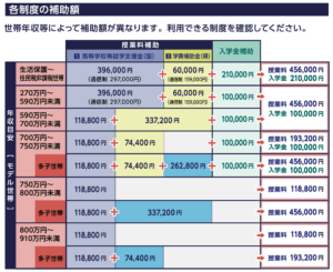 国と県では私立高校の授業料の無償化を進めています。表にあるように世帯年収が700万円未満の場合は授業料456,000円が補助されます。この後こうした補助は拡充していくようです。