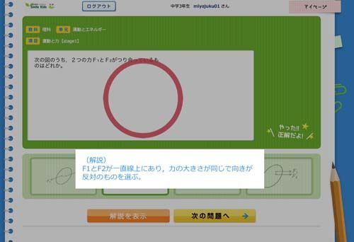 問題は各stageともに数十問の中からランダムに5問ずつが出題されていきます。四者択一式のドリル演習で、間違った選択をすると残った3つの選択肢のうち2つが反転して、どちらかが正解というようにしぼり込まれます。もちろん、解説も表示されます。