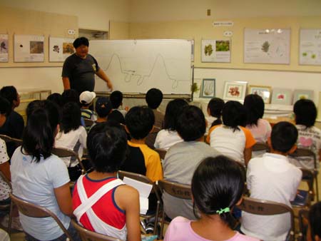 標本づくりの後、「みやまたなご」の産卵のビデオを見る。この博物館では「絶滅危惧種」のこのたなごのふ化、育成に力を入れているとのこと。その後、コオロギ相撲の実演で盛り上がる。あっという間に時間は過ぎていった。
