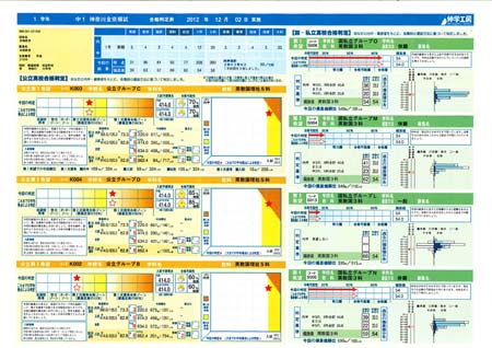 中1は偏差値別にグループ分けされた高校群の中から、公立3グループ、私立4グループの判定になっています。前期の学校成績も登録してありますので、それも加味しての判定になっています。現状の実力と学校成績でどのレベルの学校群に合格出来るのかの目安がわかるようになっています。中2生は志望校判定です。実際の高校ごとの入試基準にしたがって、学校成績と模試得点で合格可能性が出ています。