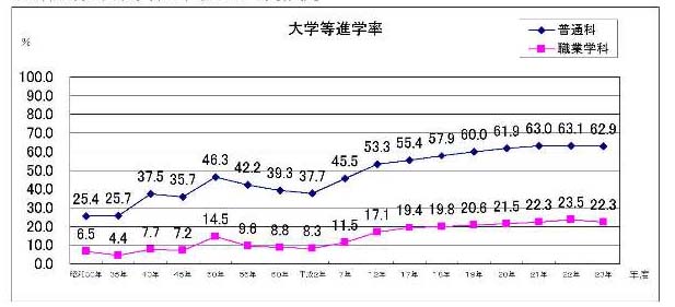 上のグラフをみてわかるように高等教育への進学率は年々アップしています。十数年前は三十数%だったのですから、進学率はほぼ倍になっているわけです。また、大学の設置基準が緩くなり、毎年のように新しい大学ができ、新しい学部が100近くもつくられています。