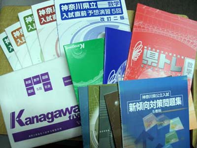 まずは教材だ。写真にあるように、塾向けに出版社が出している「神奈川県の公立高校入試に対応した教材」は、ほとんどを注文して比較検討している。この写真にある量の3倍〜4倍ほどのものを比較、検討した。