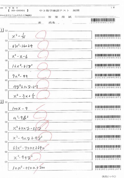中学生は春講習中に学習したことの確認テストをおこなっている。miyajukuでは「Super学習メビウス」というシステムを利用して確認テストをおこなっている。下は土曜日に実施した中3生の「式の展開」の確認テストの解答用紙。問題は、パソコン上で単元ごとにわたしが選んで作る。たくさんのデータベースの中から選ぶので難易度も自由に設定できる。今回は公式がしっかりと理解できているか、置き換えて展開が出来るようになっているか、のふたつを確かめるために問題を作成した。