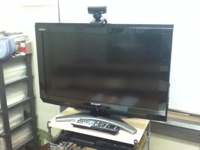 写真の26インチのテレビはその下に置いてあるPS3とつながっています。このPS3にはビデオチャットが出来るシステムがもともと入っていて、そのシステムを使って海外のネイティブとつなぎ、英語の授業をおこなうという仕組みです。1か月ほど試用期間ということでお借りしました。