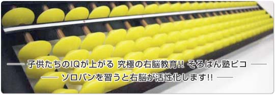 計算は、通常【左脳】を使います。 論理的に分析する、計算する…これは全て左脳の仕事です。九九も、インド式計算も、この左脳を鍛える訓練に過ぎません。でも、SOROBAN(ソロバン)は違います。右脳に働きかけて、計算を映像としてとらえていくのです。だから瞬時に計算ができるのです。ほら、皆さんも見たことがあるでしょう。驚異の暗算が出来る子供たち…。彼らは左脳を使っていません。右脳の中に映像イメージをつくりだしているのです。