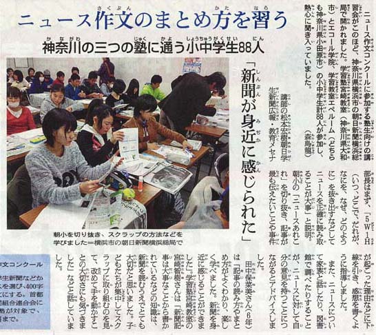 まずは、12月1日に生徒たちを横浜まで連れて行き、朝日新聞の横浜支局で開催された「ニュースの読み方と作文の書き方講習会」の様子を紹介した記事です。