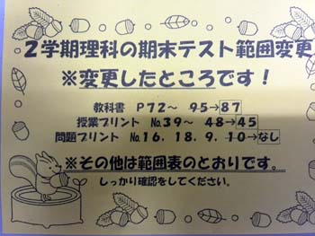 本来、試験の範囲というのは、先生と生徒の約束事のようなモノで、そう簡単に変わっていいものではないはずだ。下の写真は、今回のテストで△△中の理科の先生が生徒に配ったものだ。こうしたものを配って生徒に周知させるということは、この先生が試験範囲を大切にしているからだろう。本来はこうあるべきではないだろうか。