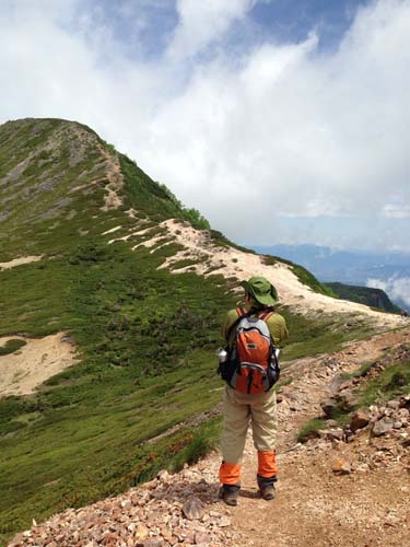 稜線まで上がると森林限界をこえて、山岳風景が広がります。昨日は歩き始めの6時頃はガスっていて眺望を期待していなかったのですが、登ってみたら急にガスが流れ始めてうれしい景色を見せてくれました。