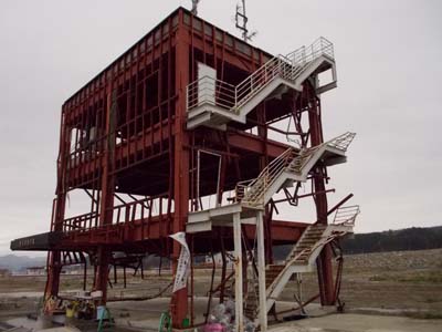 つぎは気仙沼の向洋高校です。右側が新校舎だったようです。3月13日に移転予定だったのが、その2日前の3月11日に津波が押し寄せて2階部分まですべて破壊されてしまっています。津波の被害にあった建物は外見はきれいなのですが、中はすべて洗われてしまって破壊し尽くされているのが特徴です。この高校の生徒たちは今も仮校舎で授業を受けているようです。
