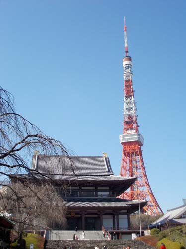 新橋駅から歩いて愛宕神社へ。その後、増上寺、丸山古墳と散歩。きれいな冬空を背景に増上寺と東京タワーです。梅もちらほらとほころんでいます。