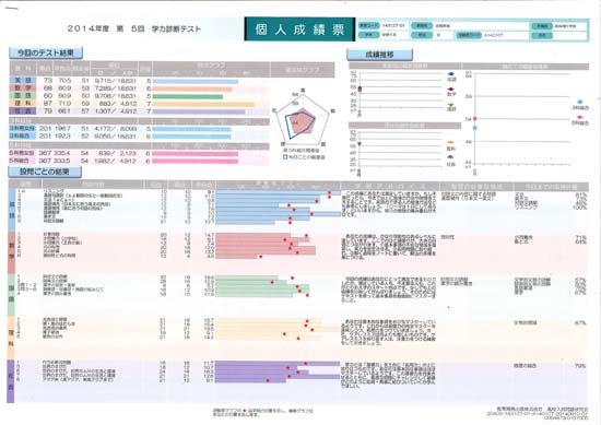 注目して欲しいのは5教科のバランスです。偏差値を比較してみて下さい。どのの教科がへこんでいるのか、つまり不得手なのかをしっかりと把握しましょう。また偏差値が50をきっている教科は今後はかなりの努力を必要とする、と覚悟をしましょう。どの教科もSS55をこえることがとりあえずの目標値です。