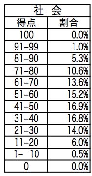 昨年、急激な難易度アップをし、今春入試では揺り戻しで易しくなるかと考えていましたが、ほぼ昨年並みの難易度でした。このまま社会はこのレベルの難しさを継続していくのでしょう。90点以上が1%、80点以上でも6%と、成績上位層の生徒でも解くのに苦労している様子が良くわかります。と同時に、理科と違ってきれいに正規分布しているのがわかります。ここに社会の難易度アップの鍵があります。