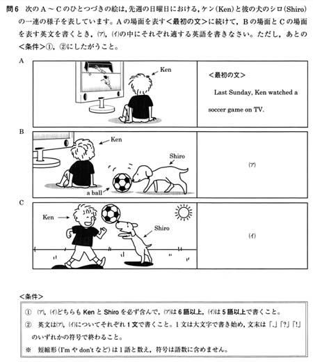 これは他の教科にもいえることですが、解答を導き出すまでのステップ数が上がってるのが今回の神奈川県公立高校入試の特長です。「ケンはシロがボールを運んでいるのを見た」という日本語を英作文するのでなく、イラストからその状況を読み取って英作文をさせているのです。