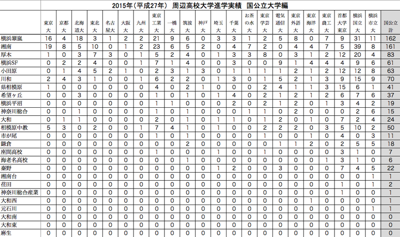 湘南と翠嵐の2校が他とは違う実績です。すごいのは相模原中等教育です、今春、初めて卒業生を出した県立の中高一貫校です。浪人はいないのですから、そのまま現役合格の実績です。1学年が160名の規模の学校ですから、ほぼ3人に1人が国公立大に進学した、ということになります。その点から見るとすでに湘南も翠嵐も抜かれた、といえるでしょう。しかも、東大/5名、京大/3名、東京工業大/7名、一橋大/4名とすごい実績です。