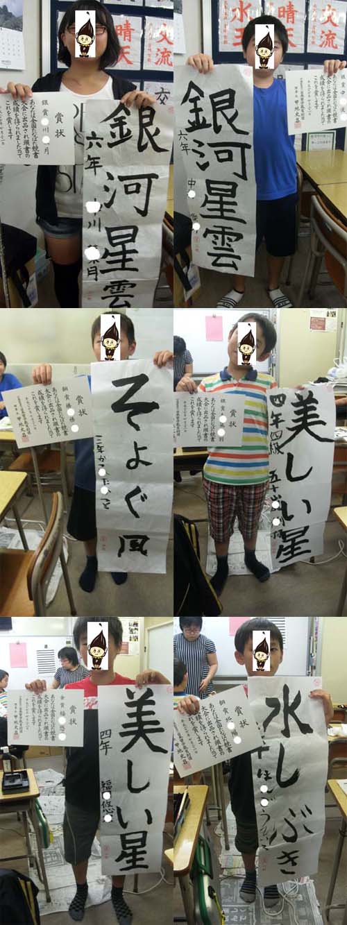 教室に飾って欲しい、という要望が強かったのですが、七夕競書作品は大きいので掲示できません。それじゃ、写真を撮ってHomePageに掲載してあげる、ということで納得してもらいました。