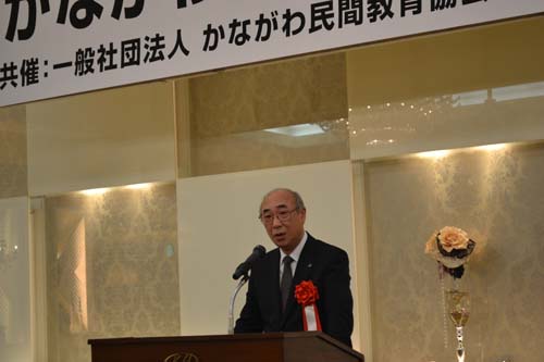 まずは、会長、牧島衆議院議員、神奈川県の教育長、県民局長と挨拶が続きます。会場には、県内の私立高校の校長先生を中心に、学習塾や教育関連企業の方々がお座りです。