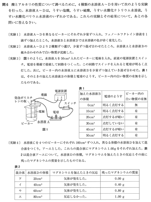 化学分野の問題で、このあとに(ア)から(エ)まで問題が続きます。正答率は、47.9%、31.4%、27.9%、21.7%と、理科全体からいうとそれほど難しくはなかった問題です。それでも、文字量だけでなく、表の数値を読み取ったり、実験から考察したりと、しっかりと情報処理が出来ないと全く太刀打ちできない出題です。