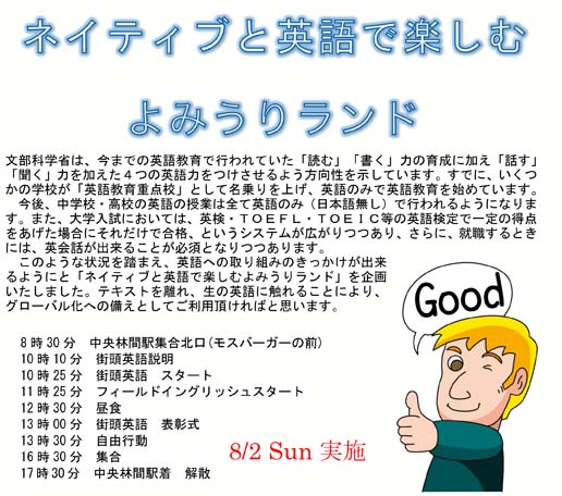 8月2日(日)におこないます。対象は小学生から高校生まで。英語力が同程度の生徒でグループを作りますから、英会話初心者から、日常会話が出来る生徒まで、そのレベルに応じて楽しく学習出来るプログラムです。