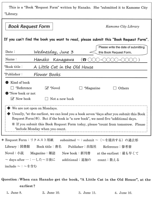 ここまで情報を読み取って丁寧に数えていくと6月15日というのがわかります。しかし、ここにワナが仕掛けられていて、15日は月曜日なので休館日なのですね。したがって本を受け取ることは不可能です。ですから解答は6月16日ということになります。まぁ、こんな意地悪な出題そのものがかつての神奈川県の高校入試ではあり得ませんでした。