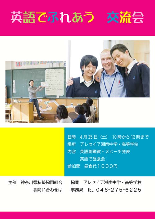 4月25日(土曜日)に、神奈川県私塾協同組合主催、アレセイア湘南中学・高校のご協力で、下記のように「英語でふれあう交流会」を実施します。