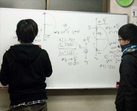 そんな私の勤務時間とほぼ同じ時間を塾で過ごしているのが高3生たちです。授業は最大でも8時間ほどですが(それでもそんなに授業が入っているんですね)、それ以外の時間も私が「閉めるよ」と声がけするまで机に向かっています。今も二人が白板で問題を解いています。
