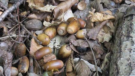 気持ちの良い登山道です。里山です。コナラ、クヌギ、ミズナラなどの広葉樹の林です。ドングリがたくさん落ちていました。細長いのがコナラ、丸いのがクヌギです。20分ほどで浅間山、そこから10数分で権現山。りっぱな展望台があり、たくさんのハイカーたちで賑わっていました。野鳥がたくさん観察されるようで、立派なカメラを持った人たちも何人もいます。桜の木がたくさんありました。