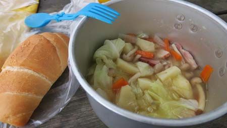 権現山から15分ほどで弘法山です。どこからも秦野の街が望めます。小田急線もよく見えます。残念ながら富士山は雲の中でしたが、横浜のランドマークタワーや熱海の初島は見えました。弘法山で昼食。朝、冷蔵庫の中にあったものを切って持ってきました。ポトフです。パンは秦野駅の北欧パンで購入。わたしは塩パンです。旨かったです。