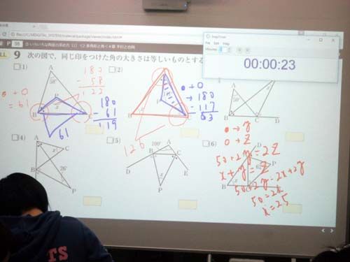 写真では画面上にタイマーが出ています。わたしの授業では「はい。この問題は3分20秒ね」といった感じで授業が進んでいきます。