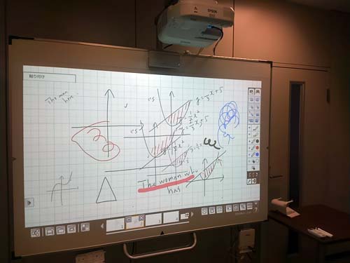 前にも書きましたように、今のmiyajukuの環境は、PCを大きなディスプレイとリンクさせて映し出し、その下のホワイトボードに板書して授業を進める、といった形態です。電子黒板を導入するとそうした作業がひとつになるというイメージです。PCとリンクした画像が映し出され、その上に薄い膜があって、その膜の上にわたしがいろいろと書いていく、といった様子でしょうか。