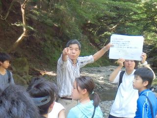 朝ご飯をいっぱい食べた後、午前の学習でした。渓畔林の役割を学習です。日陰をつくり、昆虫などのえさを供給し、生き物の生息場所も提供しています。渓畔林のしっかりした沢から流れる水は、台風の後もにごりません。