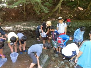 網を持って水生生物の採取にうつります。流れの速いところ、流れの遅いところ、深いところ、浅いところと、様々な場所で採取してみます。カジカガエル、そのオタマジャクシ、沢ガニ、ヒキガエル、ミズスマシ、ブドウ虫・・・ たくさんの生き物がとれました。もちろん、どんなところに多様な生き物がいたかもわかりました。