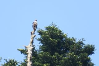 午後は、樹木についての学習をしながら、養魚場まで歩きました。もみの大木にびっくりです。もみは湿気を吸いやすい木材とのこと。床材などに使われたそうです。人工林と自然林の違い。森の成り立ちなどについて歩きながら学びます。中村さんが遠くにクマタカを発見。望遠鏡を出していただいて観察です。わたしのカメラは600mmの望遠なので撮ることができました。