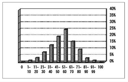 得点分布は以下のようになっています。きれいな正規分布ですね。受験者の1/4が51点~60点に分布し、41点~70点に60.5%が集中しています。合格者の平均点は51.7点でした。