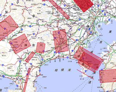 すごいですね。上の写真は、「地震ハザードステーション」http://www.j-shis.bosai.go.jp/ で表示させてみた神奈川県を中心とした「主な活断層」です。