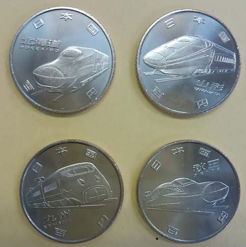 新幹線開業50周年の記念硬貨で、山形、秋田、九州、北海道の各新幹線の絵柄が表側に、裏はあの0系新幹線の絵柄になっています。ちょっとうれしかったです。数はたくさんありそうでしたから、皆さまも交換にいかれてはどうですか?