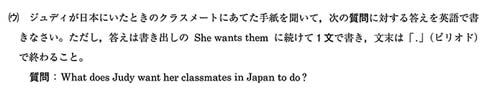 また、(ウ)の問題は、昨年度から「英文を聞き取って英語で設問に答える」問題になっていました。形式は今年も同じだったのですが、want + 人 + to-不定詞の構文で、ふたつのことを聞き取って答えねばならず、正答率は10%を切っているのではないかと思います。かなりの難易度でした。