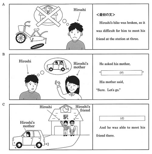 問6は毎年のように漫画での出題です。下のような内容のもので、空欄の(ア)と(イ)にあてはまる英文を考えて作文します。こちらも問5と同じようなステップが必要ですが、よりしっかりと「どんな英文を作るか」を考える必要があります。