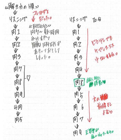 まず、この生徒は「解く順番」について反省し、つぎは「こんな順番で」解いていく、と決めている。と同時に、自分にとっては「問8」が得意問題なので、そこにしっかりと時間をかけていく、とも作戦だてをしている。とってもよい(^^)