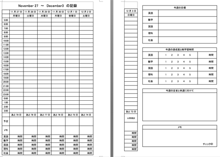 手帳をつけはじめさせた11月20日から入試日の2月15日までは86日間。この86日間を「あと12週間で入試だ」というとらえ方をさせている。そして、その1週間ごとに、それぞれの教科で「何をやっていくか」を計画させる。それも具体的にだ。最もダメなのは「英語を頑張る」などといったもの。これは計画とはいわない(多くの生徒はそうなる)。