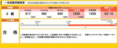 英検の結果は合否だけではなく「英検CSEスコア」というのに注目をしてください。下の写真は、今回の英検で2級の1次試験に合格したmiyajukuの高2生のものです。