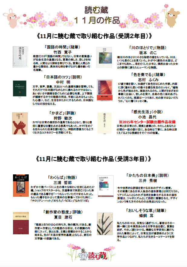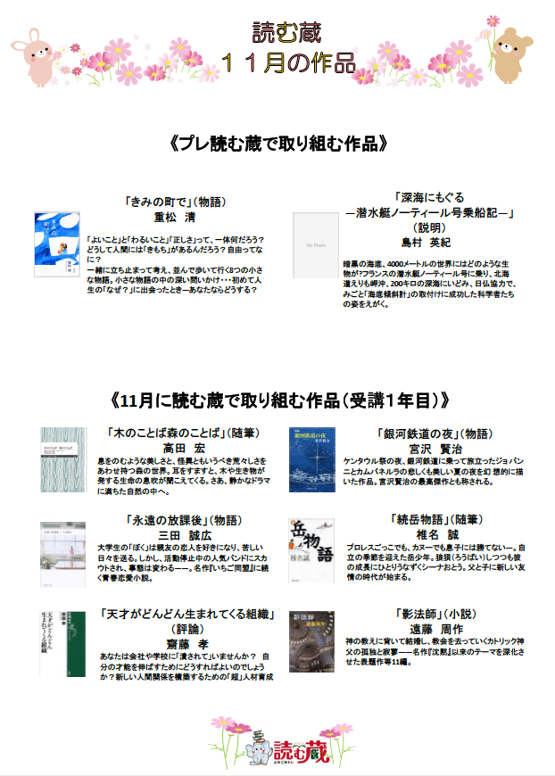 「読む蔵」は、miyajukuの小学生の私立中受験クラス、国語選択者、週イチ個別の生徒。中3生。高校生の文系の生徒。これらの生徒には必修にしています。それ以外の学年の方で「読む蔵」を選択したい方はわたしまでお申し出ください。また、毎月のお知らせを見て、こっちの作品を読みたいな、というリクエストにもできるだけこたえたいと思います。よろしくお願いします。