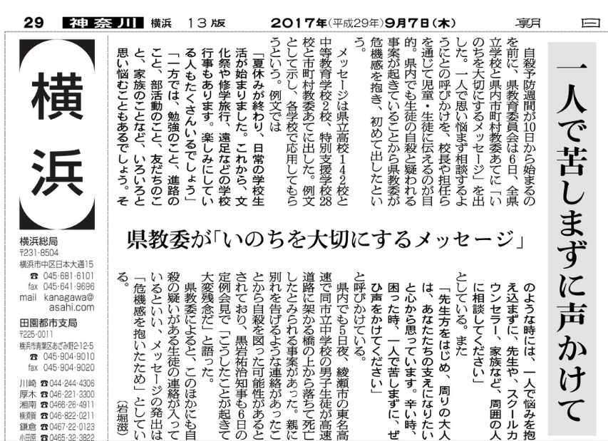 県教委が「いのちを大切にするメッセージ」を県内県立高校すべてに出し、各市町村教委宛にも出した、ということです。