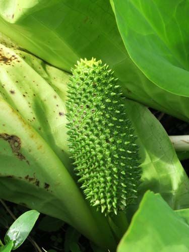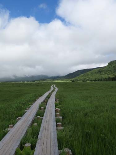 ミズバショウの花(白い花の部分は本当は葉)が終わったあとの円柱状の「花序」と呼ばれる部分(こっちが本当は鼻の部分)が、熊の好物で、かじられたあとがたくさんあったのにもびっくり。