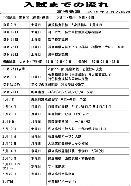 塾の流れを中心にした「受験までの流れ」は、プリントして生徒たちに配ります。