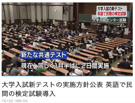 2020年の大学入試改革で最も大きな変更となる英語の入試ですが、文科省は「民間の検定試験の導入を正式に決定した」というニュースです。ただし、最初の4年間は従来のセンター試験も継続し、受験生は志願する大学の求めに応じて検定試験かセンター試験のどちらか一方か、両方を受けることになります。
