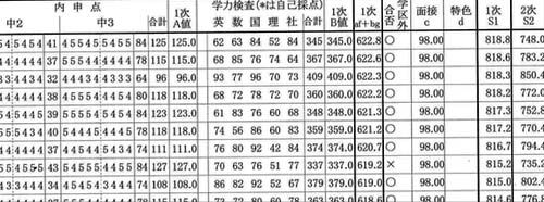 つぎの一覧は、今春入試での△△高校の受験者の成績を並べたもののほんの一部です。学校成績が上から「125→115→96→118→123・・・」と並んでいます。右の方に入試得点も「345→367→409→360→348・・・」と並んでいます。この高校は、内申:入試:面接が3:5:2の配分です。ただ、面接は全員に98点がついているので、結果的には内申と入試だけで合否が決まります。1次S1値というのが、それぞれの生徒の換算得点で、順位はこの数字で並んでいます。