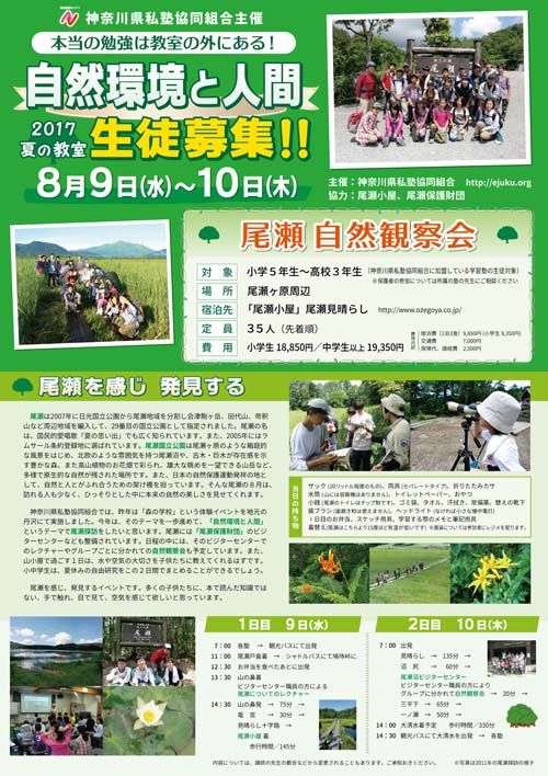 8月9日〜10日にかけて1泊2日で「尾瀬の自然観察会」をおこないます。現地では、環境省の自然観察員の方との観察会なども予定していて、世界的にも貴重な湖沼としての尾瀬を歩きながら、自然と人の関係を考える機会にしたいと思っています。すでに申込書はお送りしています。ただ、現段階での申し込みが少なく、このままでは実施ができない可能性もあります。せっかくの機会です。たくさんの参加があることを願っています。上り下りのない木道のハイキングです。小学4、5年生以上であれば十分に歩くことは可能です。よろしくお願いいたします。