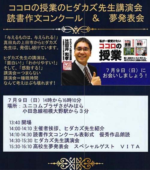 miyajukuからも十数人の入賞者が出ました。それらの生徒には、個々に表彰式への招待状を渡します。本人だけでなく、お父さん、お母さんもご一緒に来ていただければと思います。当日は、比田井先生の「ココロの授業」と「高校生の夢発表」もおこないます。miyajukuの東脇さんが夢をみんなの前で発表します。